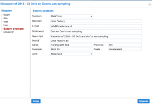 De dag voordat de nieuwsbrief eruit gaat, graag de lijst van contactpersonen klaarzetten via PV op Mailchimp.