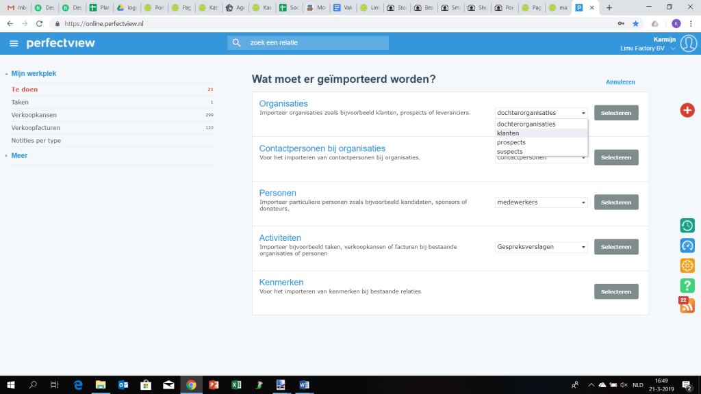 Instellingen (rechts, wieltje)ImporterenKlik op ‘Nieuw’ Organistaties – klanten – selecterenVoorbeeld downloadenhet volgende sowieso invullen: 7. opslaan en uploaden in pv