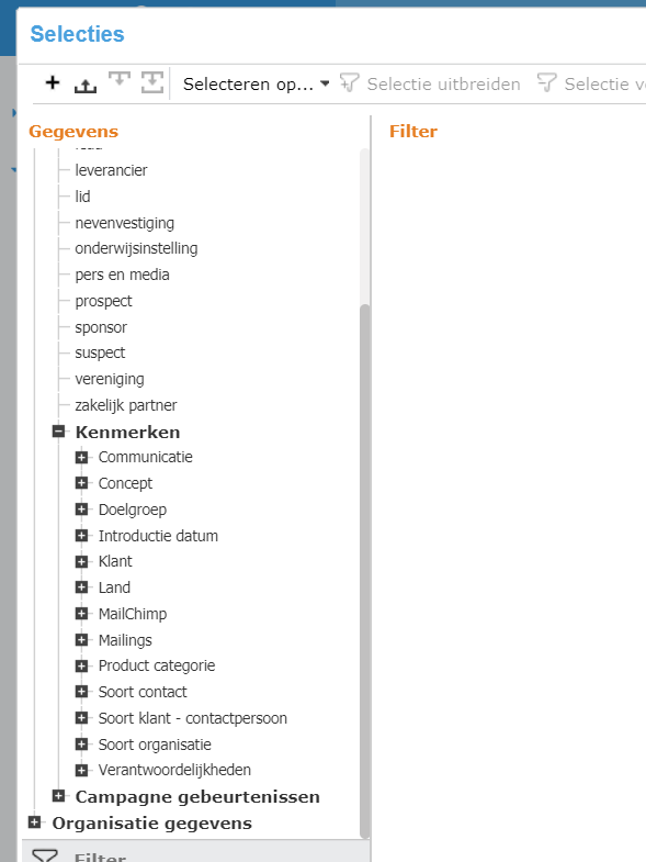 Als je vervolgens de selectie criteria wil verkleinen, klik je op ‘selectie verkleinen’ bovenin. Zo kun je andere categorieën uit filteren.