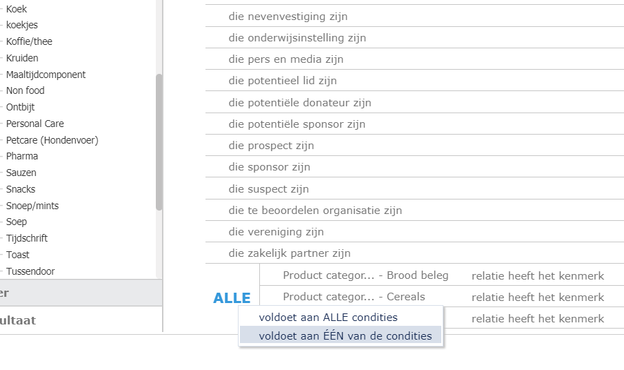 Klik met rechtermuis op ALLE en vervolgens: ‘voldoet aan één van de condities’.