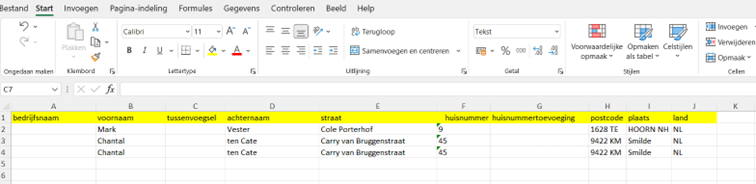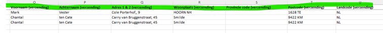 - Let op! Dit moeten wel de kolommen zijn waar verzending in staat. Als je per ongeluk de kolommen facturering pakt dan kan het zijn dat je naar het verkeerde adres verstuurd.