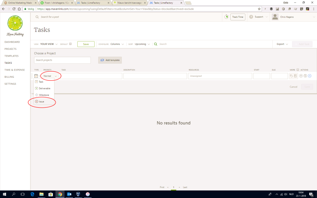 Klik op + Add Task. Kies het project waar de bug bij hoort. Selecteer bij type ‘issue’ en status ‘new’, selecteer de juiste prioriteit en wijs de taak toe aan de juiste persoon, deze persoon zal een e-mail ontvangen met een link naar de aangemaakte taak.