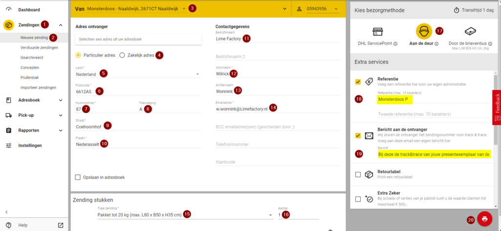 stappen. Bij stap 20 maak je het etiket aan en wordt je zending aangemeld bij