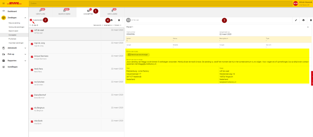 Selecteer alle concepten (2) en controleer of alle gegevens bij 3 correct zijn. Is dat het geval dan druk je op print (4). Let op: dit is ook het moment dat eventuele mailtjes naar de ontvangers getriggerd worden. Je etiketten worden nu aangemaakt en je zendingen aangemeld. Je vindt ze desgewenst terug onder het tabblad ‘verstuurde zendingen’.