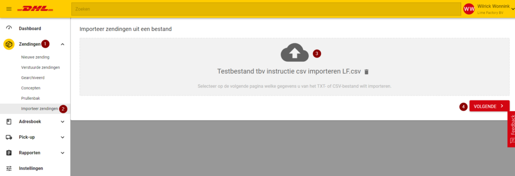 Klik op zendingen en rechtsboven op “importeer zendingen”. Vervolgens upload je het bestand en klik je op volgende.