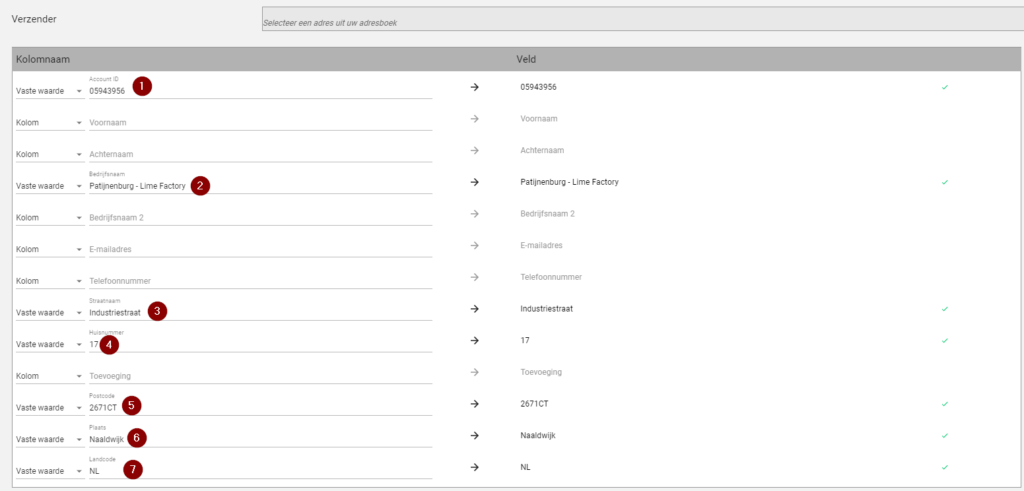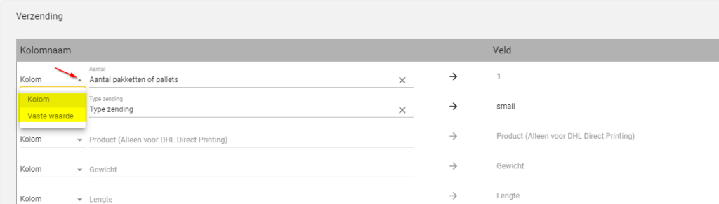 Met de pulldown bij een kolom kun je bepalen of deze waarde variabel moet zijn (dus uit de csv wordt gehaald) of vast (dan voer je hem hier eenmalig in).