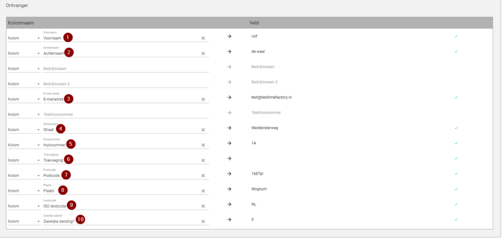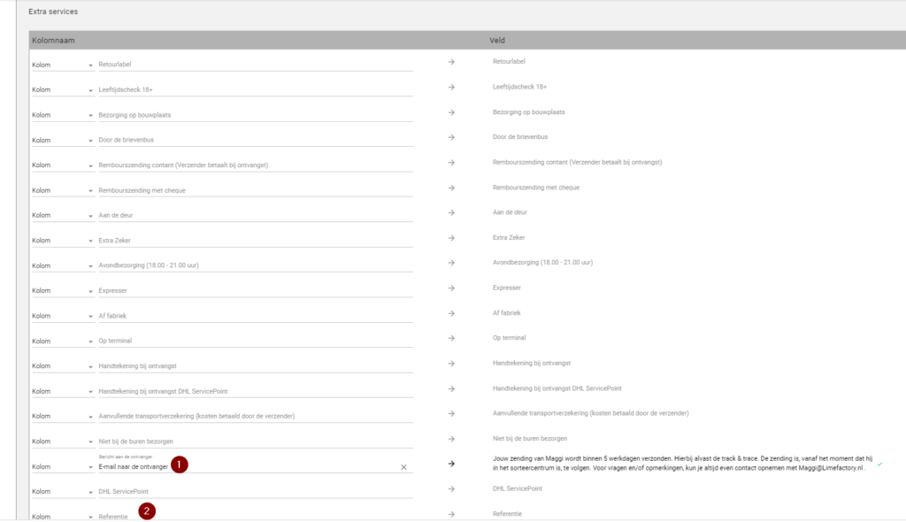 Wij gebruiken alleen de velden email naar de ontvanger en referentie als standaard, anderen zijn optioneel of worden gedefinieerd door het type zending (bijvoorbeeld bij een particulier adres is default bezorging aan de deur).