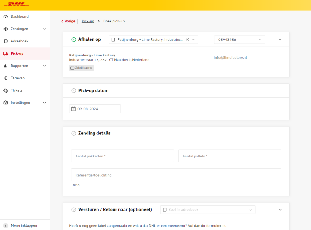 Zodra de labels zijn aangemaakt stuur je deze naar Patijnenburg of Mivas, zie onderstaand “stuur een mail naar het magazijn”. Zodra je van Patijnenburg of Mivas hebt vernomen hoeveel pakketten of pallets het zijn boek je de pickup in via MDP. Doorlooptijd voor pickup is vandaag voor 19.00 uur aangemeld is de volgende dag opgehaald.
