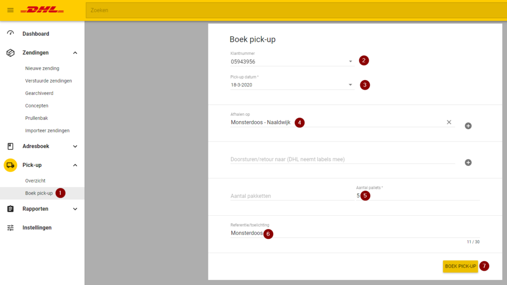 Meldt via mdp een pick up aan voor het aantal pallets of pakketten dat je op wilt laten halen. Bij meer dan 5 pallets vindt vooraf afstemming met de accountmgr (of informeel rechtstreeks met de terminal) plaats. Doorloop daarbij de volgende stappen: