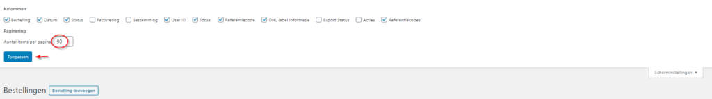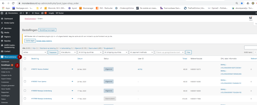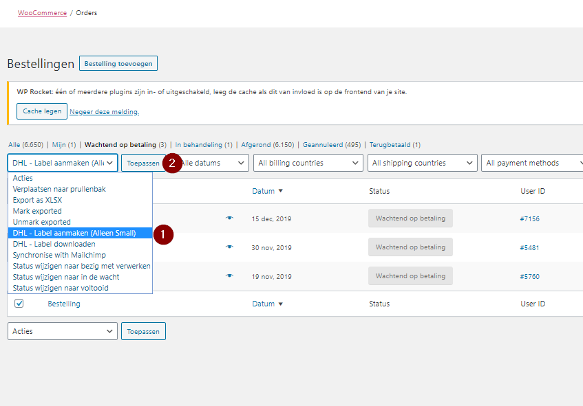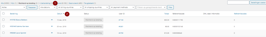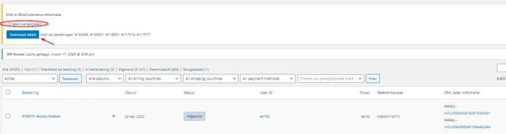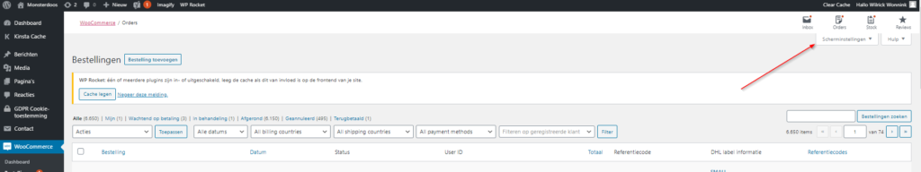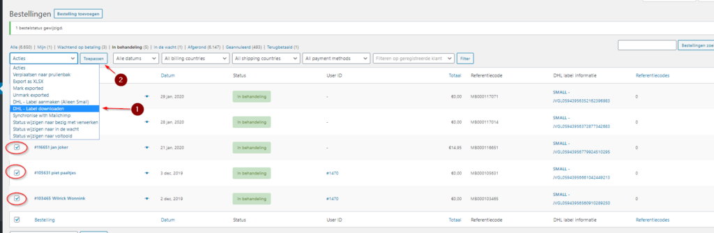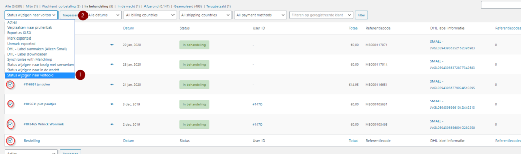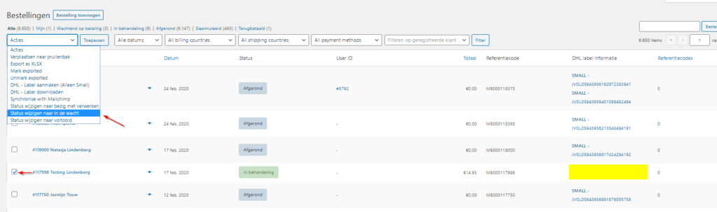 Woocommerce springt nu terug naar zijn basisscherminstelling, dus om de statussen goed te overzien en te wijzigen moet je stap ‘Selecteer de bestellingen die in behandeling zijn en sorteer ze op volgorde van aankoop‘ even herhalen. Mocht het aantal etiketten niet kloppen met het verwachte aantal, dan was er corrupte data tussen. Zoek dan in het overzichtsscherm naar de orders waar geen label voor is aangemaakt. Verander hiervan de status naar ‘in de wacht’