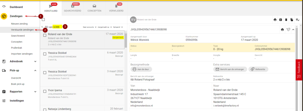 Je controleert het aangemaakt etikettenbestand met de gewenste reeks orders in de webshop (eerste, laatste, aantal) en met het scherm ‘verstuurde zendingen’ in mdp.