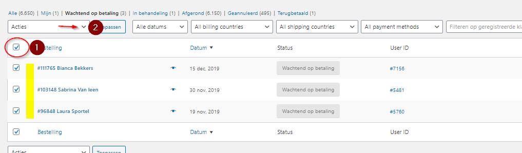 Let op: door een bug is deze handeling alleen mogelijk met de selectievakjes bovenaan de pagina. Onderaan de pagina selecteren en toepassen werkt niet op de juiste wijze!