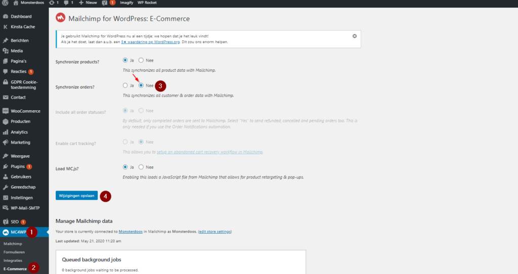 Ga na het verbreken van de synchronisatie met mailchimp naar https://monsterdoos.nl/wp-admin en selecteer achtereenvolgens Woocommerce en bestellingen: